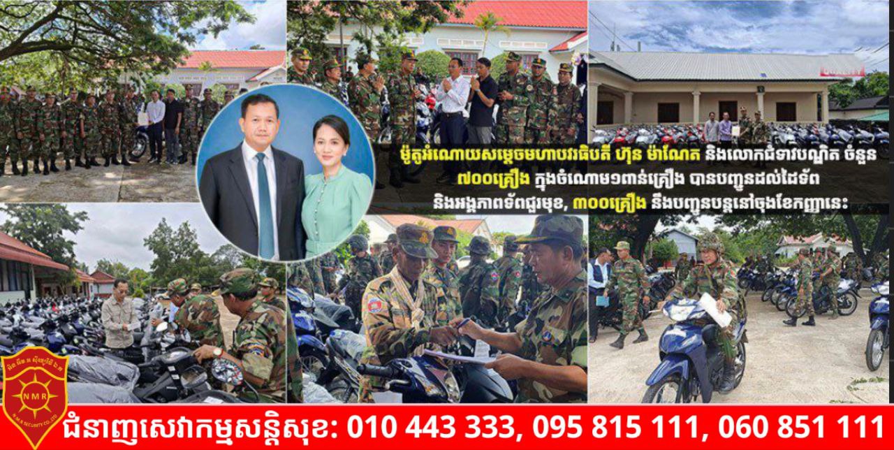 ភ្នំពេញ)៖ មកដល់ដើមខែកញ្ញានេះ ម៉ូតូជាអំណោយរបស់សម្តេចមហាបវរធិបតី ហ៊ុន ម៉ាណែត នាយករដ្ឋមន្ត្រីកម្ពុជា និងលោក ជំទាវ បណ្ឌិត ពេជ ចន្ទមុន្នី ហ៊ុនម៉ាណែត ចំនួន៧០០គ្រឿង ក្នុងចំណោម ១ពាន់គ្រឿង ត្រូវបានបញ្ជូនដល់ដៃកងទ័ព និងអង្គភាពទ័ពជួរមុខ។