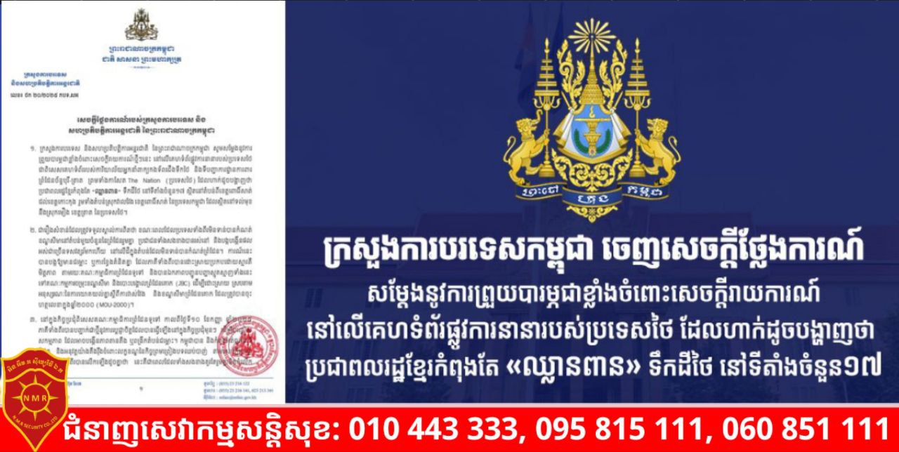 ភ្នំពេញ)៖ ក្រសួងការបរទេស និងសហប្រតិបត្តិការអន្តរជាតិ នៃព្រះរាជាណាចក្រកម្ពុជា នៅថ្ងៃទី២៥ ខែកញ្ញា ឆ្នាំ២០២៥នេះ បានចេញសេចក្តីថ្លែងការណ៍សម្តែងនូវការព្រួយបារម្ភជាខ្លាំងចំពោះសេចក្តីរាយការណ៍ថ្មីៗនេះ នៅលើគេហទំព័រផ្លូវការនានារបស់ប្រទេសថៃ ជាពិសេសគេហទំព័ររបស់ការិយាល័យអ្នកនាំពាក្យកងទ័ពជើងទឹកថៃ និងទីបញ្ជាការដ្ឋានការពារ ព្រំដែនច័ន្ទបុរី-ត្រាត ព្រមទាំងកាសែត The Nation (ប្រទេសថៃ) ដែលហាក់ដូចបង្ហាញថា ប្រជាពលរដ្ឋខ្មែរកំពុងតែ “ឈ្លានពាន» ទឹកដីថៃ នៅទីតាំងចំនួន១៧ ស្ថិតនៅតំបន់ពីខេត្តពោធិ៍សាត់ ដល់ខេត្តកោះកុង រួមទាំងតំបន់ស្រុកវាលវែង ខេត្តពោធិ៍សាត់ នៃប្រទេសកម្ពុជា ដែលស្ថិតនៅទល់មុខ នឹងស្រុកមឿង ខេត្តត្រាត នៃប្រទេសថៃ។