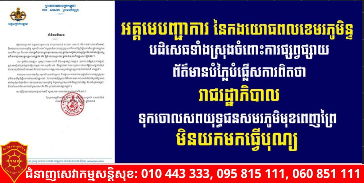 ភ្នំពេញ)៖ អគ្គមេបញ្ជាការ អគ្គមេបញ្ជាការរង នាយទាហាន នាយទាហានរង និងពលទាហានទាំងអស់ នៃកងយោធពលខេមរភូមិន្ទ សូមបដិសេធទាំងស្រុងចំពោះការផ្សព្វផ្សាយព័ត៌មានបំភ្លៃបំផ្លើសការពិត ក្នុងផេកផ្លូវកា របស់ឈ្មោះ គឹម សុខ ដែលថា «រាជរដ្ឋាភិបាលកម្ពុជាទុកចោលសពយុទ្ធជនសមរភូមិមុខពេញព្រៃ មិនយកមកធ្វើបុណ្យ ហើយអាជ្ញាធរសម្លុតគ្រួសារយុទ្ធជន មិនឱ្យនិយាយសួររកយុទ្ធជនជាសមាជិកគ្រួសារទៀតផង»។ នេះបើតាមលិខិតបដិសេធរបស់អគ្គមេបញ្ជាការ នៃកងយោធពលខេមរភូមិន្ទ នៅថ្ងៃទី២៥ ខែកញ្ញា ឆ្នាំ២០២៥នេះ។