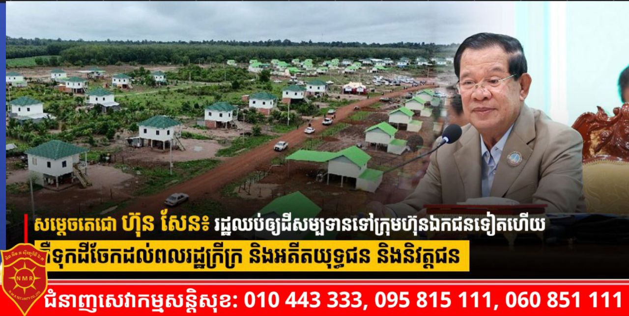 (ភ្នំពេញ)៖ សម្ដេចអគ្គមហាសេនាបតីតេជោ ហ៊ុន សែន ប្រមុខរដ្ឋស្តីទី និងជាប្រធានសមាគមអតីតយុទ្ធជនកម្ពុជា បានប្រកាសថា ចាប់ពីពេលនេះតទៅ រដ្ឋឈប់ប្រគល់ដីសម្បទាន ទៅក្រុមហ៊ុនឯកជនទៀតហើយ គឺទុកដីសម្រាប់ចែកជូនដល់ប្រជាពលរដ្ឋក្រីក្រពិតប្រាកដ និងអតីតយុទ្ធជន និងនិវត្តជន។