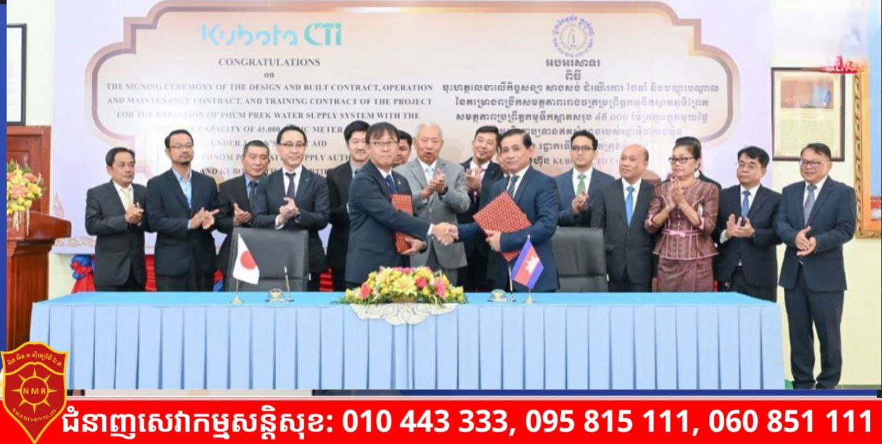 ពិធីចុះហត្ថលេខាលើកិច្ចសន្យា សាងសង់ ដំណើរការថែទាំ និងបណ្តុះបណ្តាល នៃគម្រោងពង្រីកសមត្ថភាព រោងចក្រប្រព្រឹត្តិកម្មទឹកស្អាតភូមិព្រែក ក្រោមហិរញ្ញប្បទានឥតសំណង របស់រាជរដ្ឋាភិបាលជប៉ុន រវាង រដ្ឋាករទឹកស្វយ័តក្រុងភ្នំពេញ និងក្រុមហ៊ុនKUBOTA ត្រូវបានរៀបចំឡើង នាថ្ងៃទី៣០ ខែកញ្ញា ឆ្នាំ២០២៥នេះ ក្រោមវត្តមាន លោក ឯក សុនចាន់ ប្រធានក្រុមប្រឹក្សាភិបាលរដ្ឋាករទឹកស្វយ័តក្រុងភ្នំពេញ លោក ឡុង ណារ៉ូ ប្រតិភូរាជរដ្ឋាភិបាលកម្ពុជា ទទួលបន្ទុកជាអគ្គនាយកនៃរដ្ឋាករទឹកស្វយ័តក្រុងភ្នំពេញ និងតំណាងJICA។